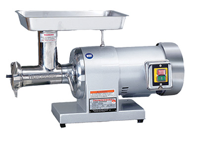 1.5 Hp electric meat grinder. Stainless steel head, worm, and knife. Grinds 18-20 lbs of meat on first grind through 3/16" plate.